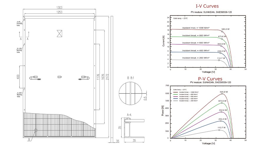La eficiencia de conversión del módulo de 210 mm y 605 W puede alcanzar un 21.4 %, una potencia de salida más alta, un coeficiente de temperatura más bajo, reduce efectivamente el costo de BOS del sistema y mejora el rendimiento del proyecto.
