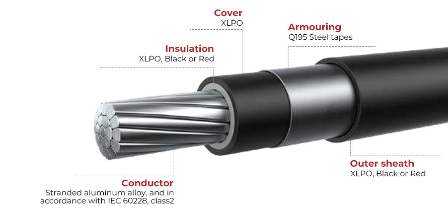 Libre de halógeno. Cable de baja tensión resistente a los rayos UV. El cable de aluminio TÜV2642 es especialmente adecuado para aplicaciones en exteriores y para enterramiento directo en el suelo.
