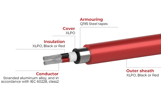 Cable blindado SUNKEAN TÜV 2PfG/2642 1500 V CC El cable de enterramiento directo con núcleo de aluminio está aislado y revestido con un compuesto de polietileno reticulado (XLPO) y es adecuado para una variedad de entornos exteriores hostiles. Pertenece a la categoría de cables enterrados directamente, que pueden ser blindados para protegerlos contra daños mecánicos y picaduras de roedores, y al mismo tiempo pueden usarse sin estar enfundados en conductos.