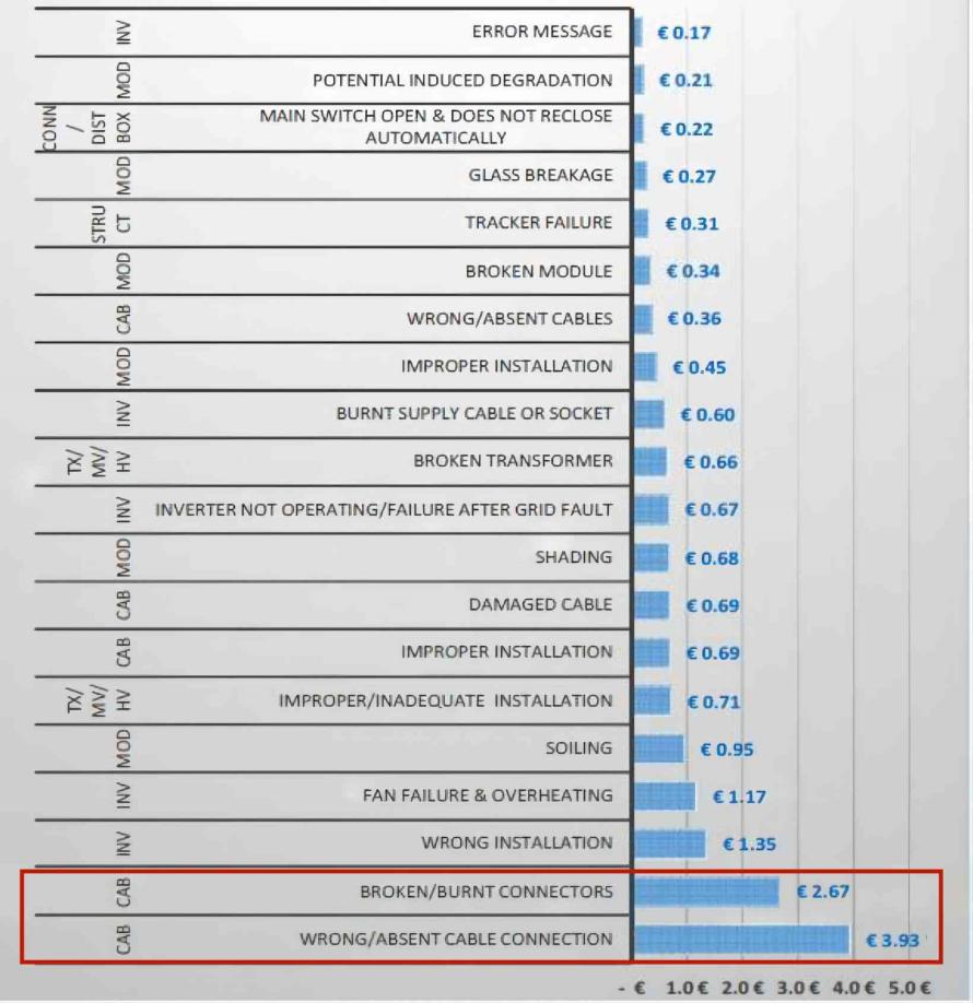El informe publicado por el equipo del proyecto "Solar Bankability" del programa EU Horizon2020 muestra que en la pérdida de ingresos de la central eléctrica causada por la falla técnica TOP20, los conectores rotos y quemados ocuparon el segundo lugar, y el primero es la conexión de cable incorrecta/ausente.