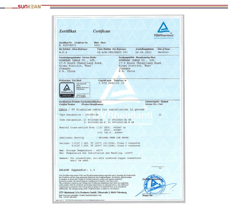 Nos complace anunciar que el cable fotovoltaico de aluminio de SUNKEAN ha logrado recientemente un hito importante al obtener la certificación TÜV: 2 PfG 2642. Esta certificación valida aún más la alta calidad y confiabilidad de nuestro producto, brindando a nuestros clientes una solución solar mejorada.