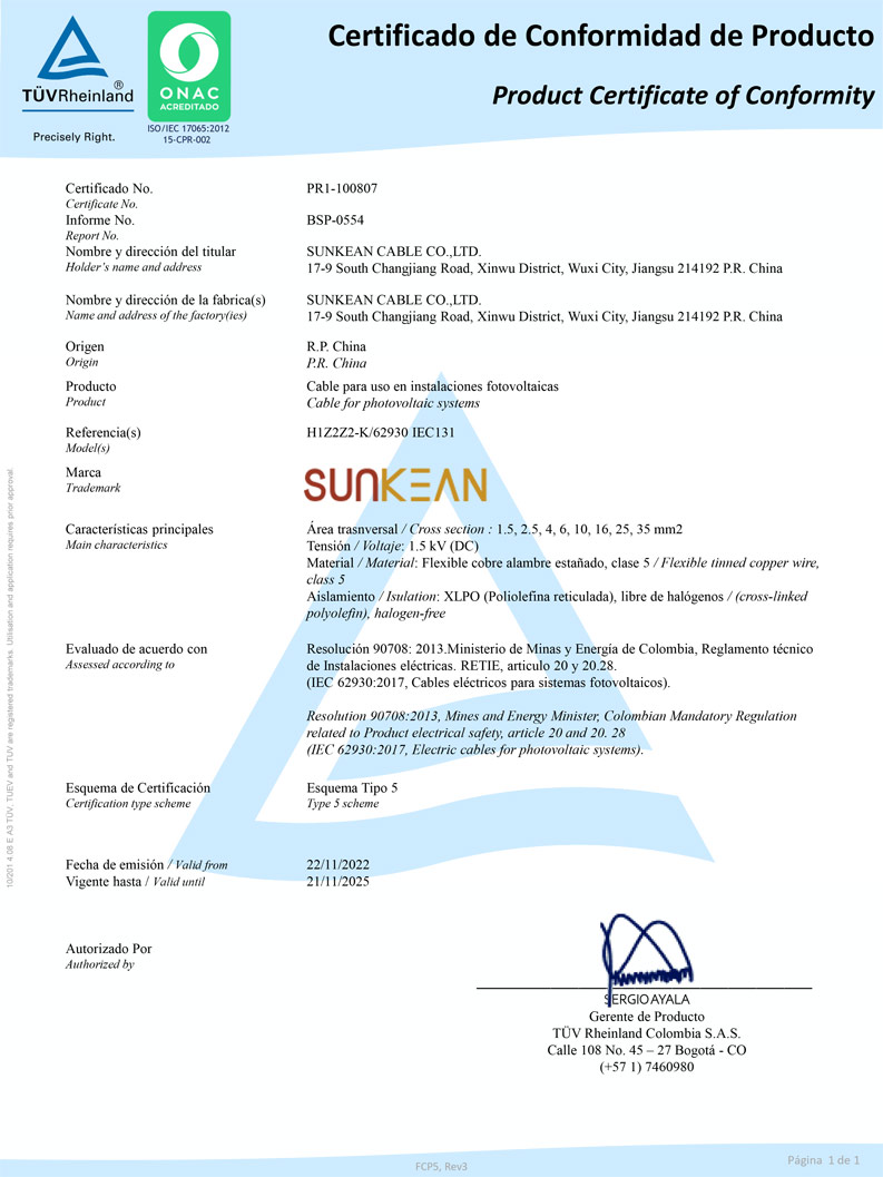 Certificado RETIE Cable Solar