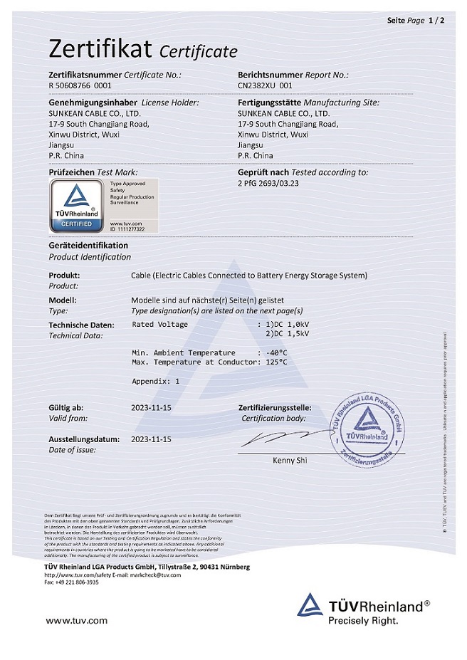 Estamos encantados de anunciar que el cable de almacenamiento de energía de SUNKEAN ha obtenido una nueva certificación TÜV : 2 PfG 2693/03.23 , que está más optimizada que la versión anunciada en 2019.